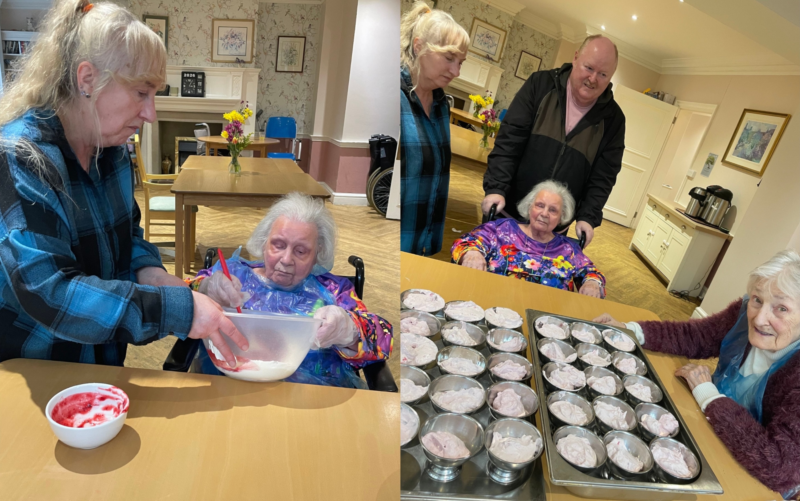 Residents Rosemary, Angela and Lorraine enjoyed preparing a delicious fruit fool, with Rosemary’s family members joining in as well. It was a delightful group activity that brought everyone together, with lots of chatting, teamwork and tasting along the way!