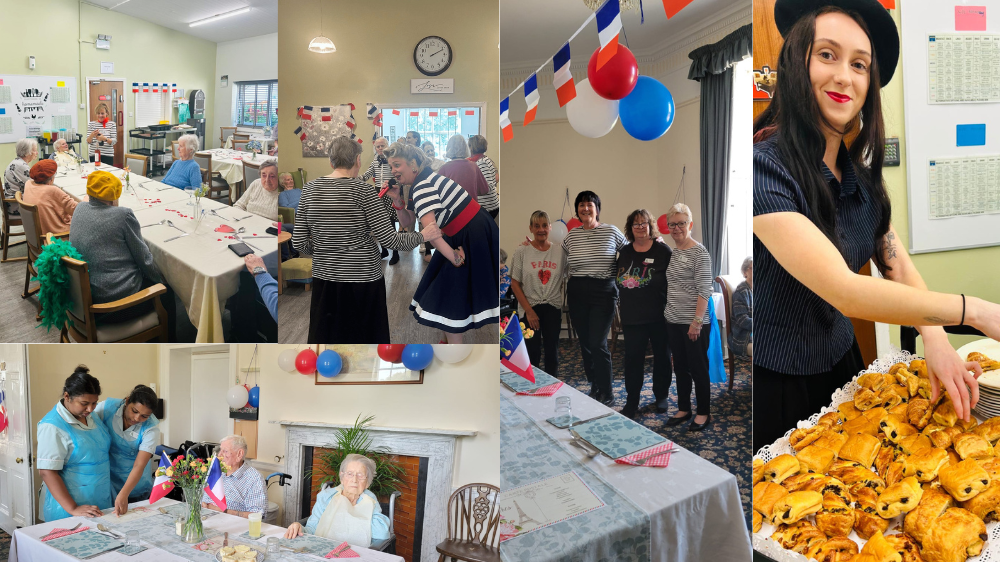 Meanwhile, The Weir Nursing Home was transformed into France, complete with chequered napkins, floral centrepieces and French flags. Residents enjoyed a beautifully curated menu featuring coq au vin, creamy garlic mushrooms, fresh baguettes, tarte tatin and chocolate éclairs. The atmosphere was made even more special by a live performance from a local singer, who amazed everyone with timeless French chansons and familiar favourites.